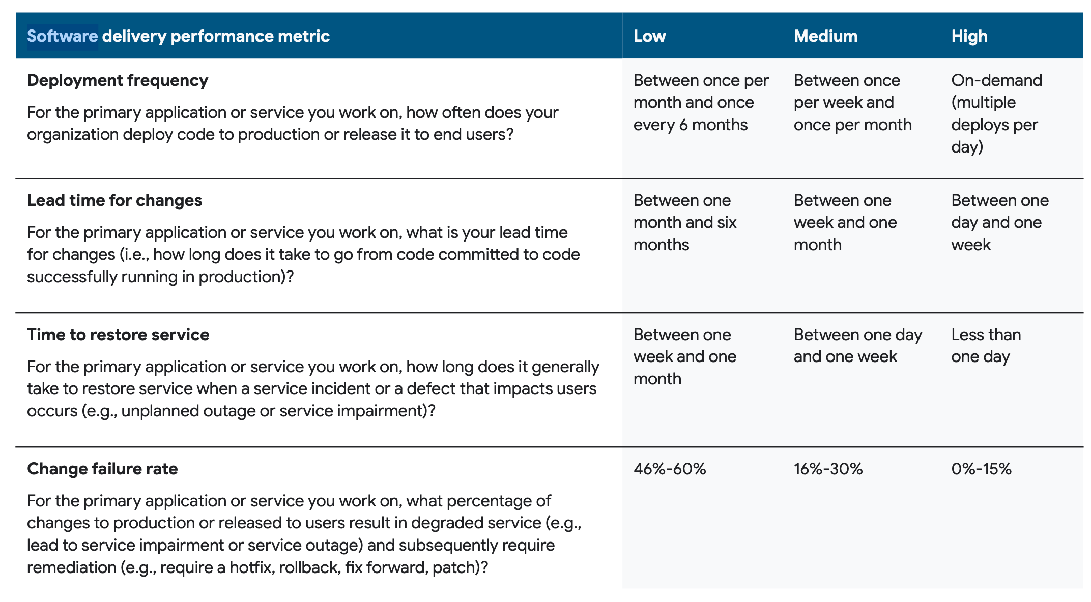 The first set of metrics that showed strong correlation between team performance and team behaviours were the DORA metrics published in 2014 by the team at DevOps Research and Assessment, made up of Dr. Nicole Forsgren, Jez Humble, and Gene Kim. The group publishes the State of DevOps report each year.
