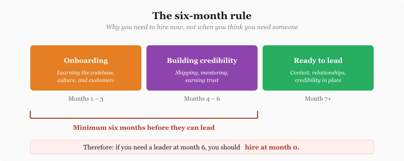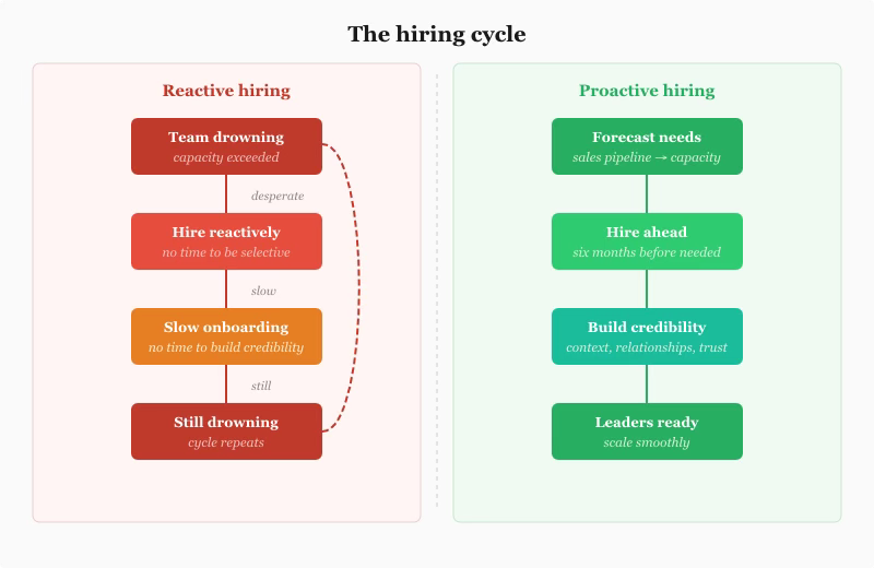 Hiring ahead can feel expensive. You’re paying senior salaries for people who won’t manage for 6-12 months. But reactive hiring is more expensive: lost momentum due to unclear decision frameworks, poor managers put in a position where they can’t succeed, low morale, and quality problems from lack of ownership.