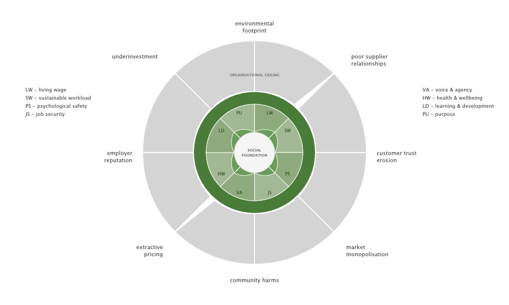 So, what would a corporate doughnut look like? The inner ring would be the social foundation, below which employees and stakeholders suffer. The outer ring would be the organisational ceiling, beyond which it would damage itself and its environment.