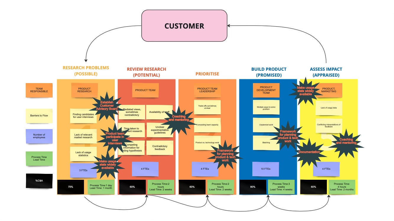 Within the Potential and Prioritised stage of the value stream, the product team complains of contradictory information and a lack of clarity over expectations and trade-offs.
