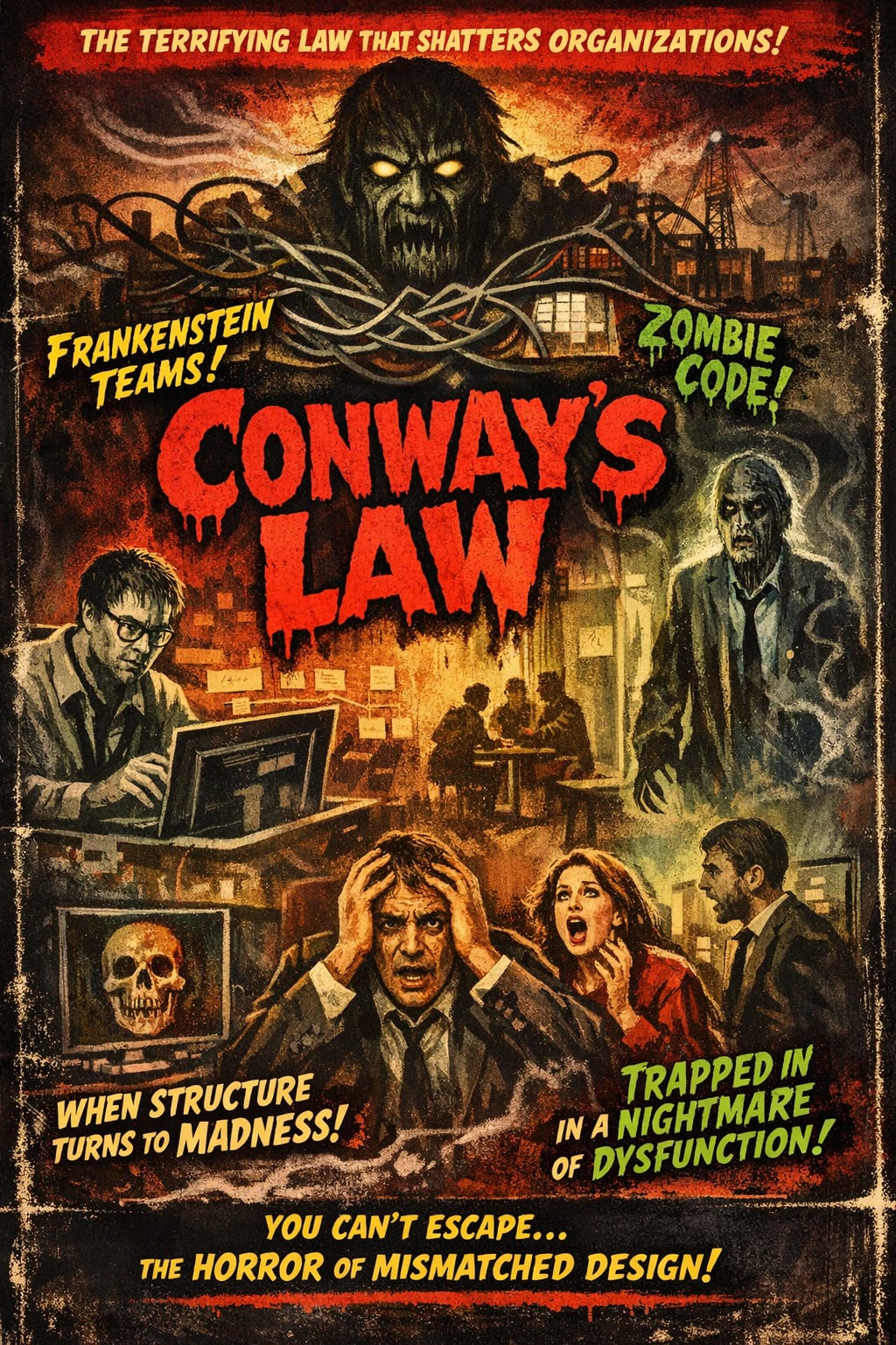 However, the hard work of mapping this new structure against the existing codebase and ensuring clear lines of ownership is rarely completed. Clean reporting structures often disguise dysfunctional approaches to system architecture. At best, there’s a Frankenstein’s monster quality to the organisation, as the mis-matches between the code architecture and the organisation structure make themselves felt. At worst, zombie code wanders the halls, searching for an owner, degrading the organisation’s security posture. Whenever an upgrade is needed or someone needs to change that code, everyone is scared to tread into the danger zone, for fear of what they find, and for fear of becoming responsible for it.